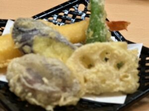 お昼ごはんは名物で手づくりした「出石皿そば」と天ぷら。