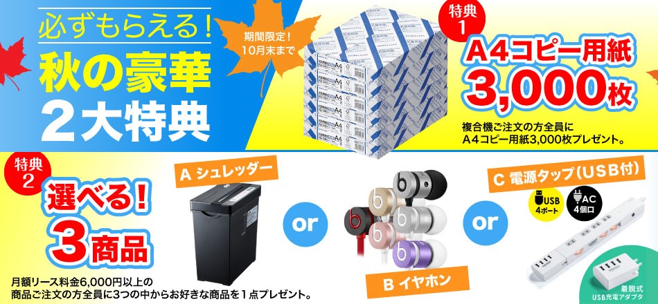 【特典1】キャンペーン中に複合機をご成約いただいた方『全員』にコピー用紙3,000枚プレゼント!