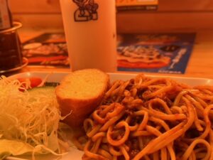 ランチも兼ねてミートスパゲッティ&サラダを食べました。
